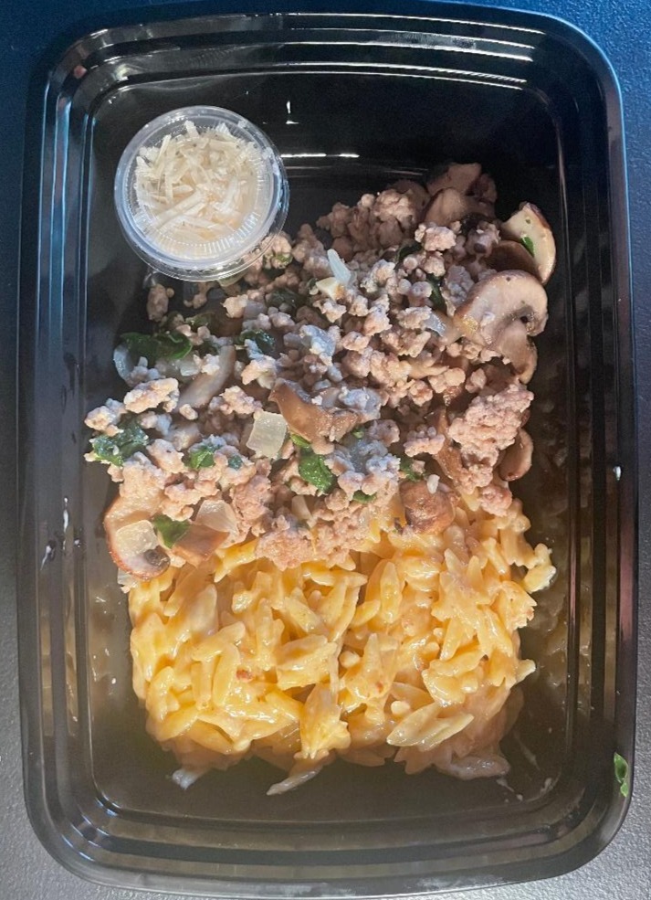 Home ground spicy Italian sausage, served with red onion, spinach and mushrooms and a creamy orzo pasta with parmesan cheese. Serving Size: 4 oz Sausage Mix, 8oz Orzo, 2oz Parmesan cheese