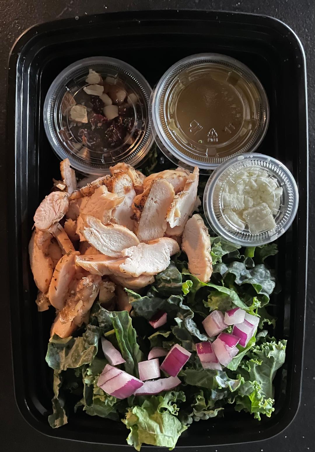 Serving Size: 1.5oz Kale, 3oz Chicken, 2oz Almonds & Cranberries, 1oz Feta, 2oz Apple Cider Dressing