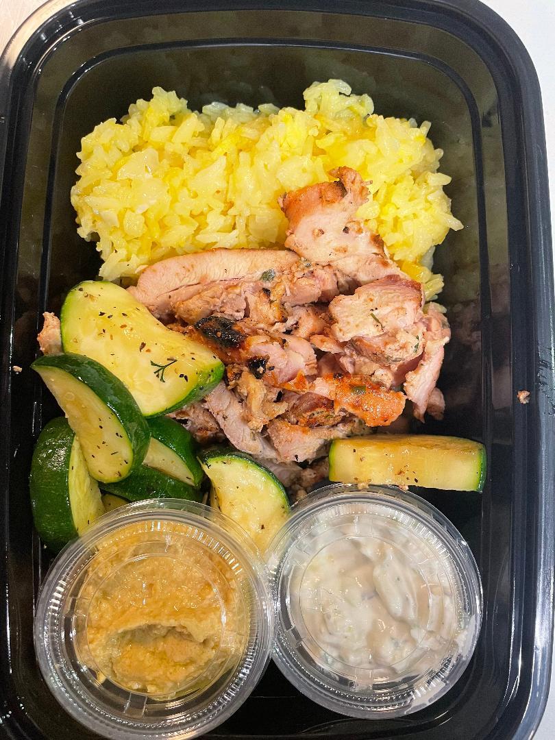 Servings Size: 6oz Chicken Thighs, 3oz Saffron Rice, 2oz Zucchini, 4oz Tzatziki, 2oz Hummus